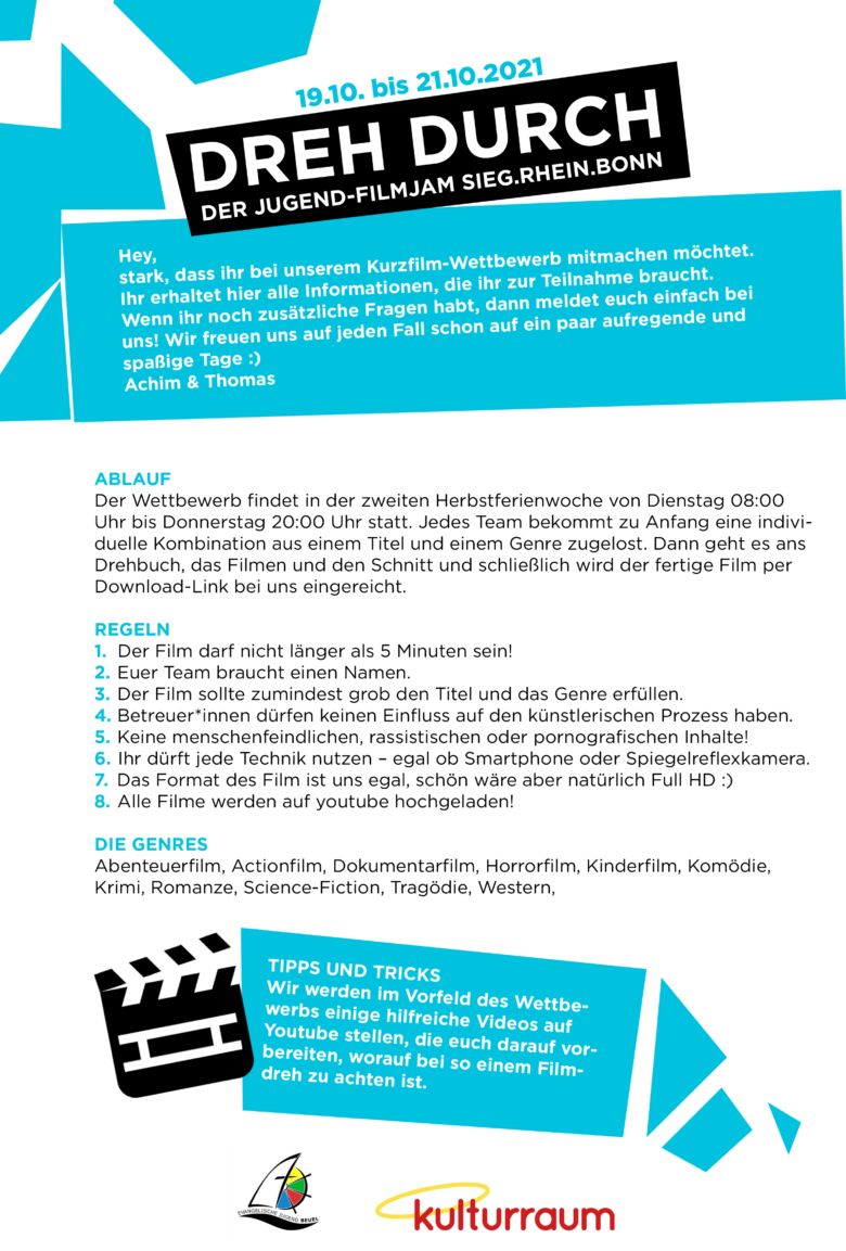 Der Wettbewerb, der gemeinsam vom Kulturraum Bornheim und dem Blauen Haus in Beuel veranstaltet wird, bietet jungen Menschen die Möglichkeit, ihr filmisches Können anderen Jugendlichen zu präsentieren und ihrer Kreativität freien Lauf zu lassen. Wie im letzten Jahr haben die Jugendlichen 3 Tage Zeit, aus einem zugelosten Titel und Genre einen Kurzfilm zu erstellen. Dieser darf nicht länger als 5 Minuten sein und muss vollständig in der Zeit von Dienstag 8 Uhr morgens bis Donnerstag 20 Uhr Abends entstehen. Die Teilnahme ist kostenlos, die Filme werden von den Jugendlichen in Eigenregie in den entsprechenden Gemeinden erstellt. Sollte es nach aktuellen Corona-Regeln möglich sein, wird es ein Finale mit allen Teams in einem echten Kino geben!