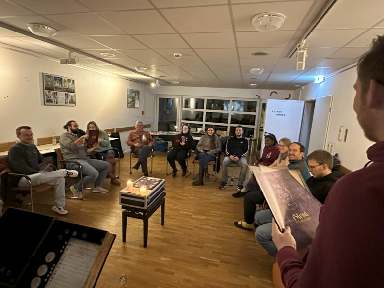 Obwohl der Tag schon viel inhaltlichen Stoff und intensive Auseinandersetzung mit diesem bot, gab es ein Abendprogramm, das in dieser Form wohl auch eine ganz neue Erfahrung für die Klausur gewesen sein durfte. Thomas Schaaf aus Bonn-Beuel hatte für die Gruppe eine Runde des Spiels „Blood on the Clocktower“ vorbereitet, die für ca. 4 Stunden zu einem echten Erlebnis wurde, das bis zum Schluss hochspannend verlief. Wer das Spiel nicht kennt: Es ist vom Grundspiel ähnlich zu Werwolf, dabei aber deutlich komplexer und ohne Ausscheidungen. Die dringend erforderliche Wiederholung dieses Abends ist bereits angefragt.